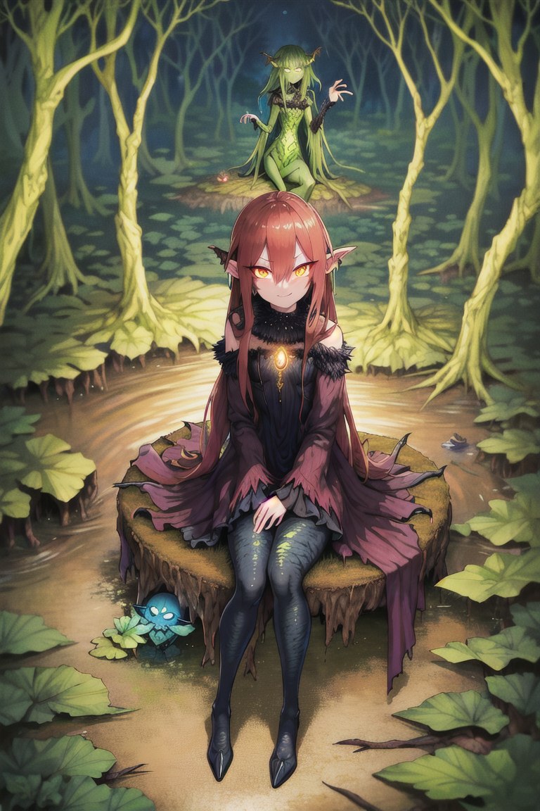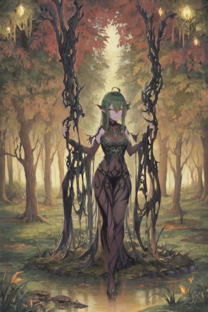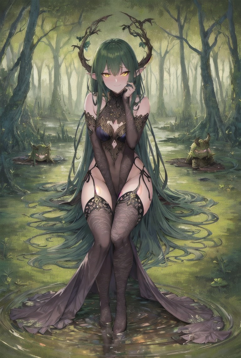 /render /seed:775861 /guidance:14 /sampler:dpm2m /size:768x1152 /images:6 <gachasplash:0.8> [[wood, stone, water]], original, extremely detailed background, wicked swamp, ((night)), dryad, cute face, mischevious, playful, mischevious attitude, anthropomorphism, sitting on ent, next to an oil pond, full body view, leaning forward, looking forwards, upper-half-human, lower-half-beast, dark swamp, small body proportions, luminescent will-o-wisps, (dryad), (wicked), ((((thorny vest, frilly yellow hoodie, jeans shorts, long socks, frills, thorns, poison, ribbons))), wet hair, plant hair, ((((tar)))) pond, (((shimmering oil))), ivy laurel, fur, soft fur, wet fur, hoofs, hard hoofs, hard shadows, [[lowres, naked, nipples, blurry, worst quality, greyscale, monochrome big breasts, assymetrical breasts, human, serene, prebuscent, logo, signature, text]], wavy hair, short hair, ((side ponytail)), detailed eyes, big pupils, ((animalistic)) eyes, plant like body, glowing orange eyes, multicolor streaked hair, dirty clothes, dirty face, smeared in oil, two-tone hair, bark skin, ivy strands, thorny roots, glowing eyes, bioluminescent green fog, black oil, tar, (detailed), outdoors, dark forest, big trees, blue roses, fluffy grass, glowing moss, small stones, (((wigs and leafs woven into hair))), dirt smudges on body, scaly skin, ribbon choker, ((dryad antlers, long antlers)), [[extra limbs, extra digits, 3d, realistic, innocent]], ((masterpiece, good quality, absurdres, ultra-detailed, color gradient)), by Shin'ichirō Ōtsuka <aom3>