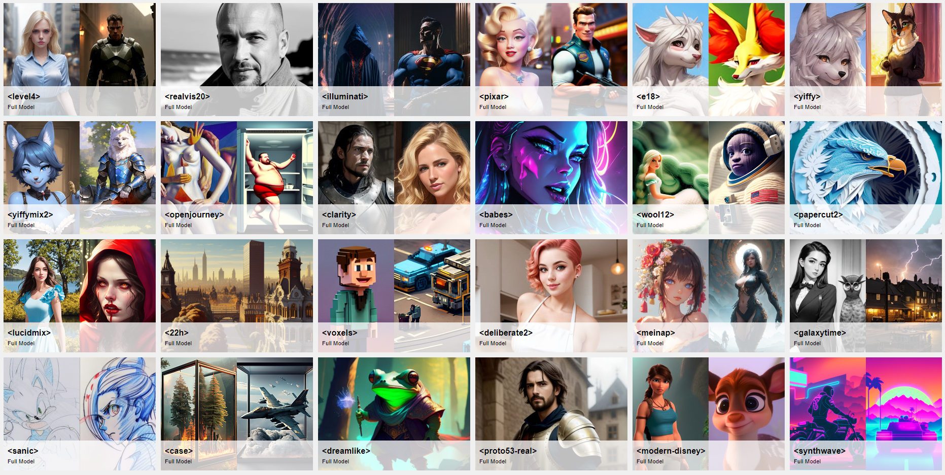 Contains: believe, aohard, meinah, lyriel16, dreamshaper, reliberate, dreamful3, realisian, majic5, majic, rpg5-beta, holokuki, bra4, bra5, aio, duchaiten, ducjourney, lofi, level4, openjourney, wool12, urpm, galaxytime, hassan14, sanic, modern-disney, wavy, proto58-scifi, expressionism, dublex