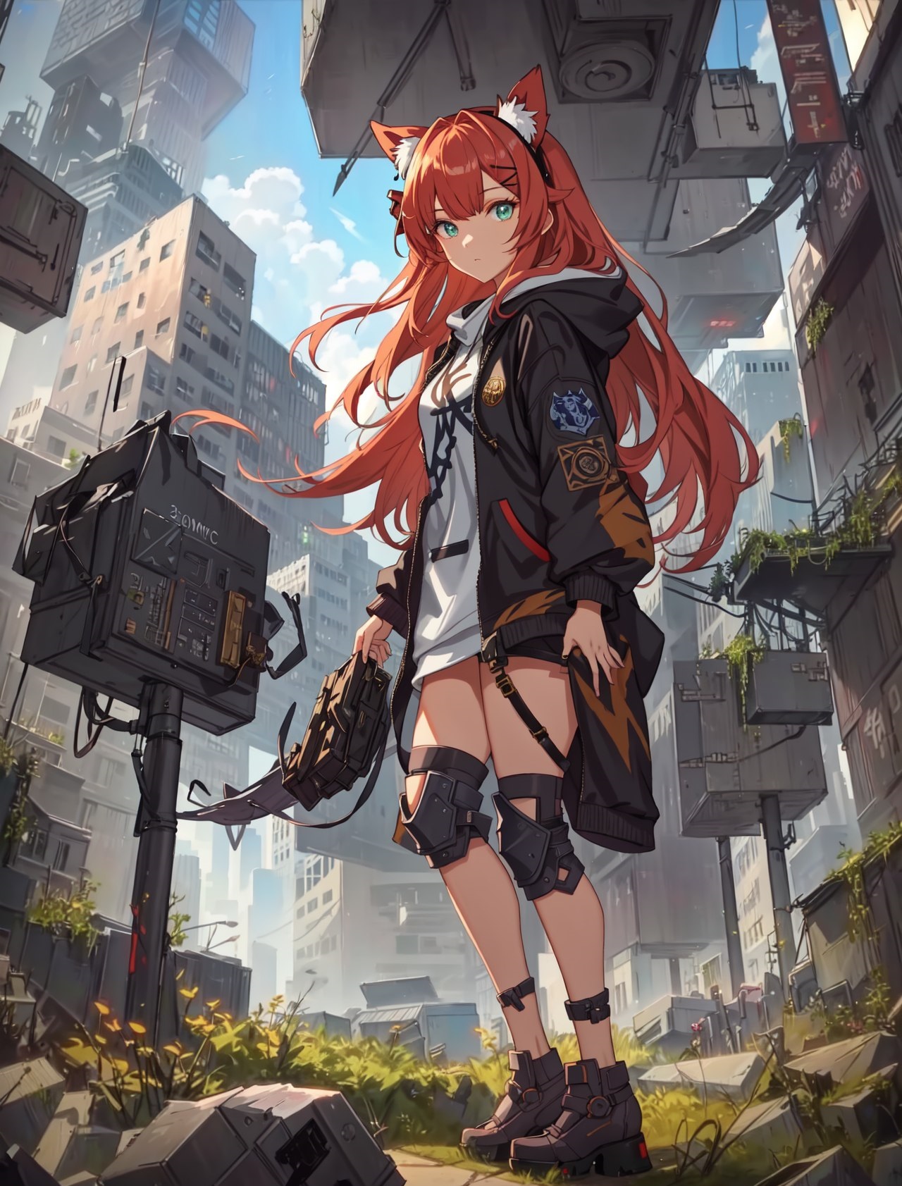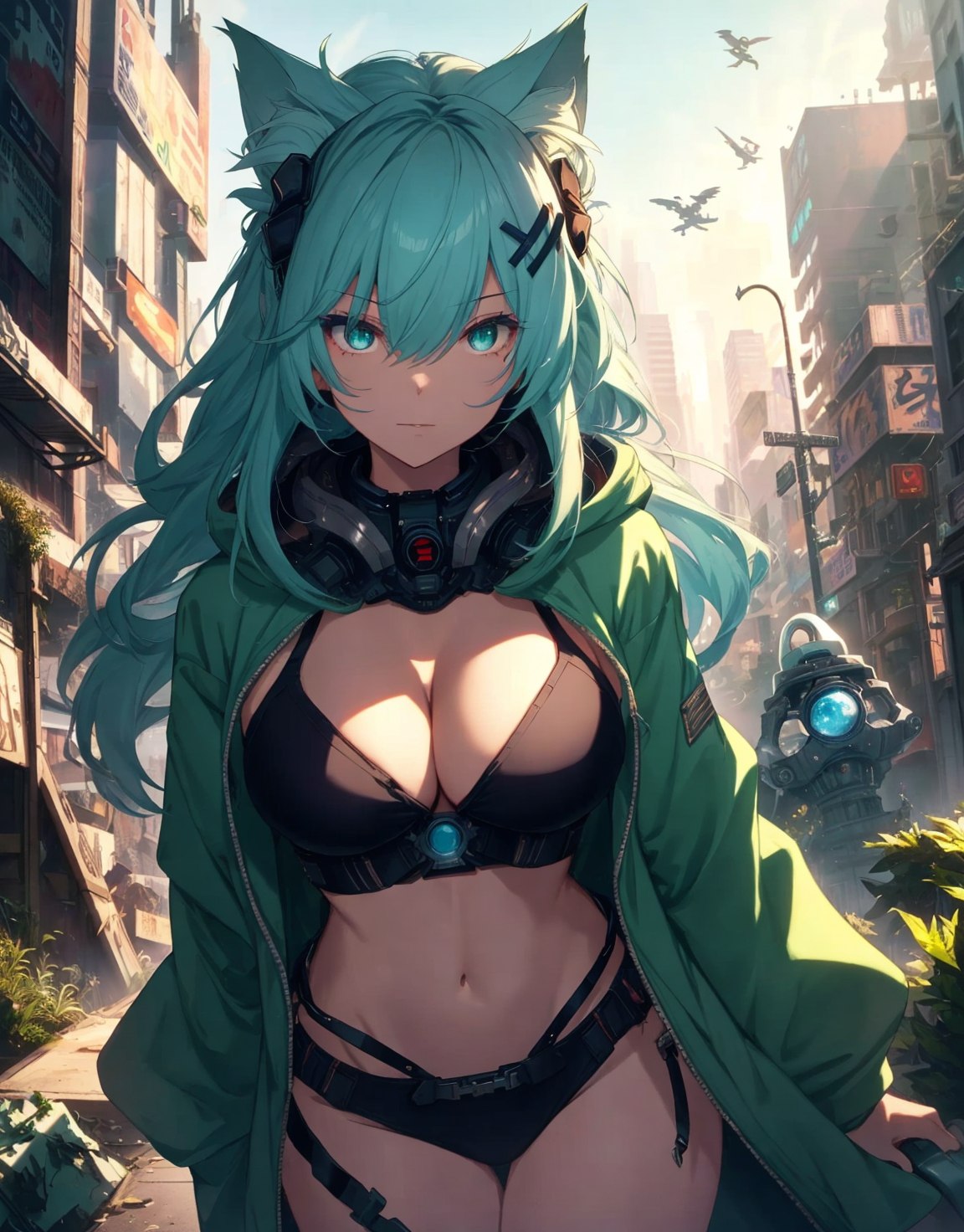 The main focus of this test is a girl inside an alien, overgrown city. A cat girl is mentioned only at the very end, but my initial testing showed that’s more than enough for a lot of girls to grow cat ears.